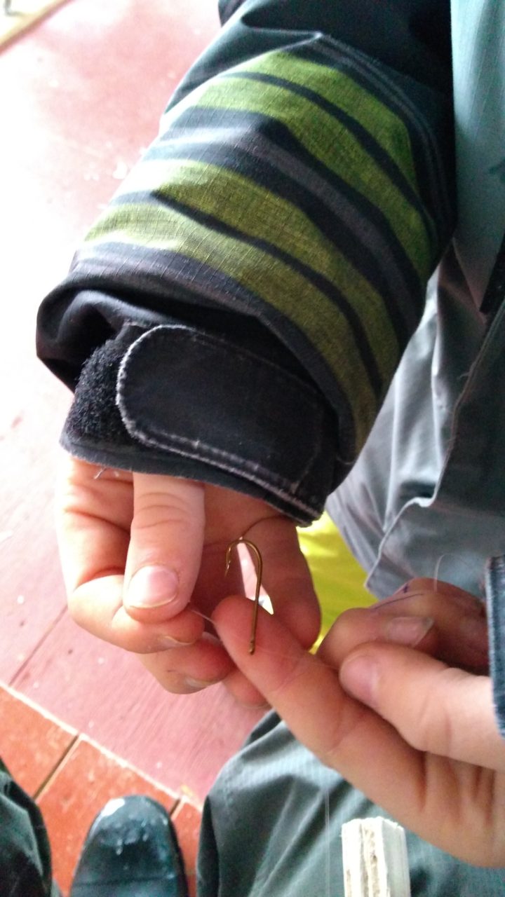 Our students had a lot of previous knowledge, skills, experience and fish stories this week. We quickly refreshed on the parts of a fishing pole and found sticks and pieces of wood to replace the rod and reel for our ice fishing needs. Students also learned a clinch knot today in order to attach their hook to their line. We then brainstormed ideas about what kind of fish live in the area, where the best spots would be to fish and different things to use as bait. Our bait today? Roe from a wild local Salmon.
